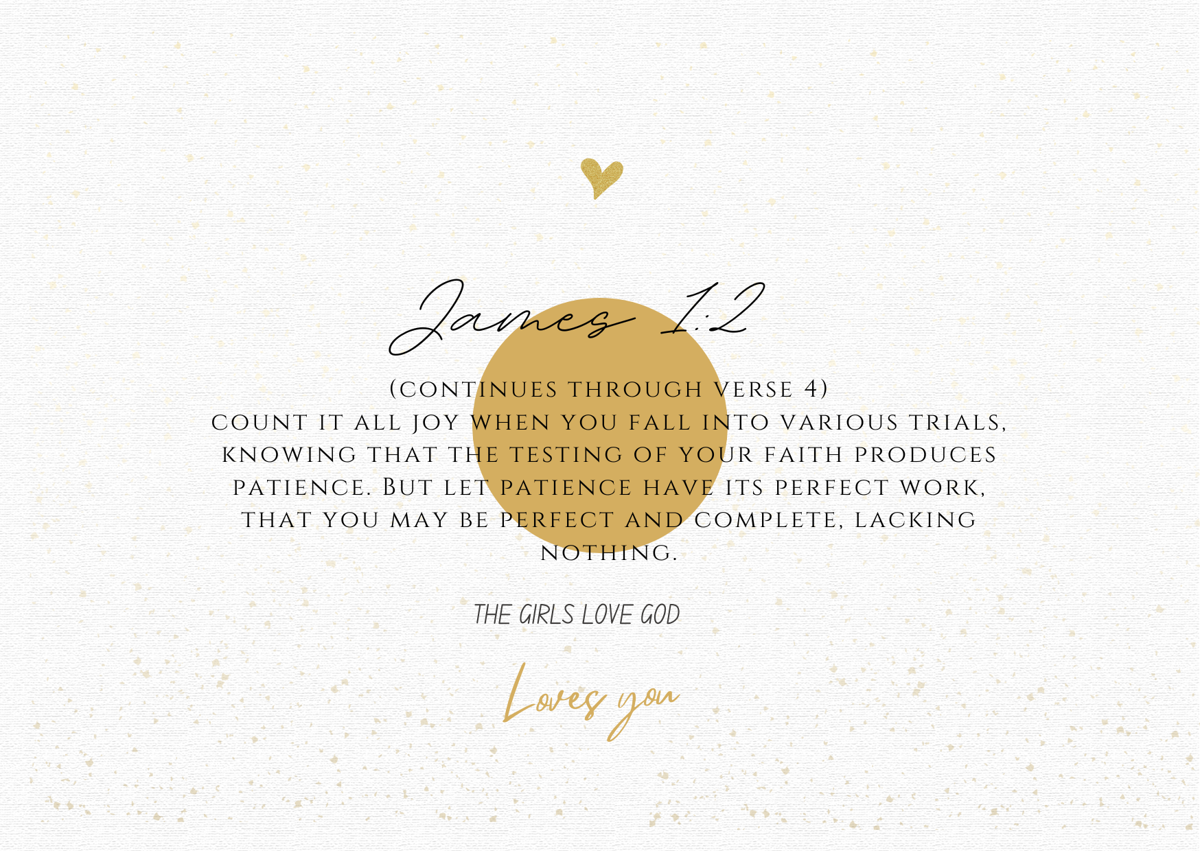 James 1:2 "Count it all joy when you fall into various trials. Knowing that the testing of your faith produces patience. But let patience have it's perfect work. That you may be perfect and complete, lacking nothing!"